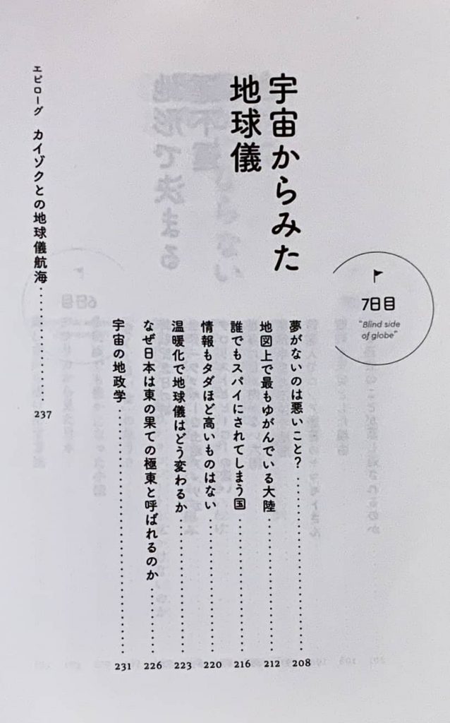 ①Everything passes through the sea ②Nuclear missiles under the sea ③Predicament of continental powers ④Dismemberment (*)of states ⑤International structure of poverty ⑥Fortunes determined by geography ⑦Blind side of globe (本書より抜粋) Dismemberment (*):the act or process of dividing a country, an organization, etc. into smaller parts (OLD)