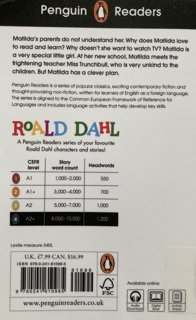 クラッシックな読み物(readers)から最新の小説まで、レベル別にご提供くださっているPenguin Readersの中から、今回は多読素材としてしばしば取り上げられる”Matilda”をご紹介します。