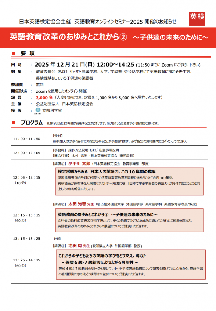 先日、日本英語検定協会主催のセミナー『英語教育改革のあゆみとこれから 〜子供達の未来のために〜』がオンラインで開催されました。(文部科学省後援)