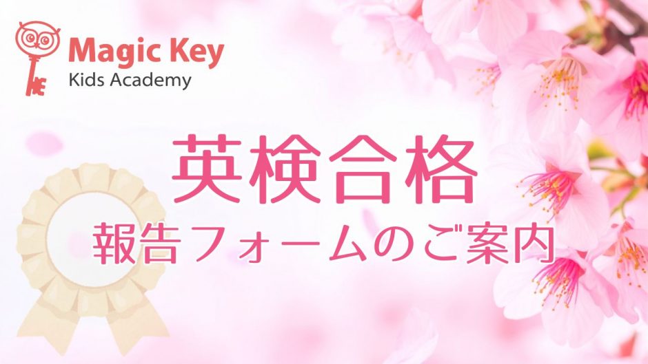 Magic Key Kids Academyでは、英検にチャレンジされた生徒の皆さんの努力をたたえ、合格の喜びを共有するために、「英検合格報告フォーム」を設けています。級ごとに分かれていますので、以下の該当のフォームからぜひ合格をご報告ください!