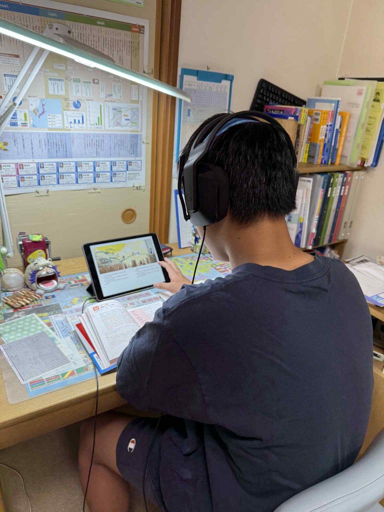 いつも自分の部屋で授業を受けているため、最近の授業の様子は全く分かりません。生活音がすると、ヘッドホンをしていても先生の話が聞き取りづらいからだそうです。ただ、たまに聞こえてくる声は普段喋るよりもハッキリとしていて、先生とのやりとりも楽しんでいるのだろうなぁと感じます。