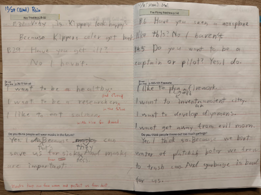 ・ブックを2回読んで質問5個(グループレッスンは3個)、回答も考える(ノート記載は親が代理で書いている)。必ずWhy 〜?の質問を作り、回答も考える。