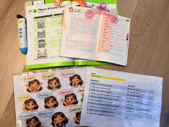 カメレオンペンの導入:授業の予習パート記載の通り、カメレオンペンを導入している。子供3人おり、同じように3番目までMK受講して英検取得を目指すため、第一子の教材準備の段階で、Kikutan3種、ひとつひとつわかりやすく5級-3級、文単準2級の音源は全てカメレオンペンに取り込み、予習を1人でできる環境を整えている。一度カメレオンペンに音源を取り込んで、教材にカメレオンシールを貼ってしまえば、第三子まで手間をかけずに取り組める見込み。現在、第二子まで活用中。