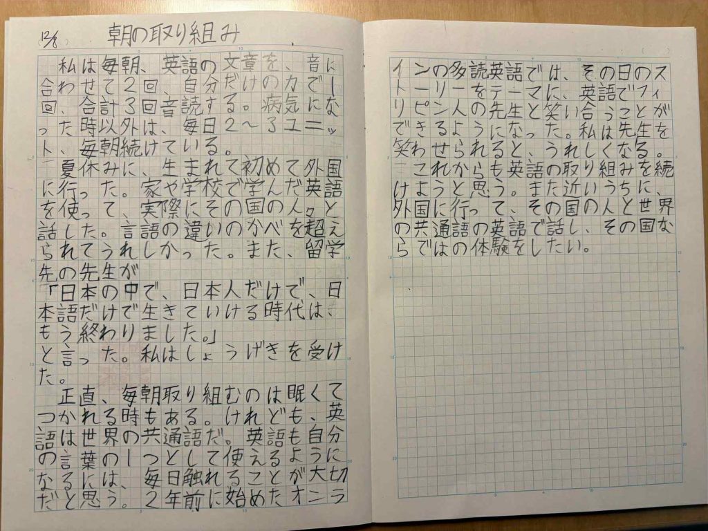 正直、毎朝取り組むのは眠くてつかれる時もある。けれども、英語は世界の共通語だ。英語も自分の言葉の1つとして使えるようになるには、毎日触れることが大切だと思う。2年前に始めたオンラインの多読英語では、その日のストーリーをテーマに、英語でフィリピンの先生と笑い合うことができるようになった。私は先生を笑わせられると、うれしくなる。