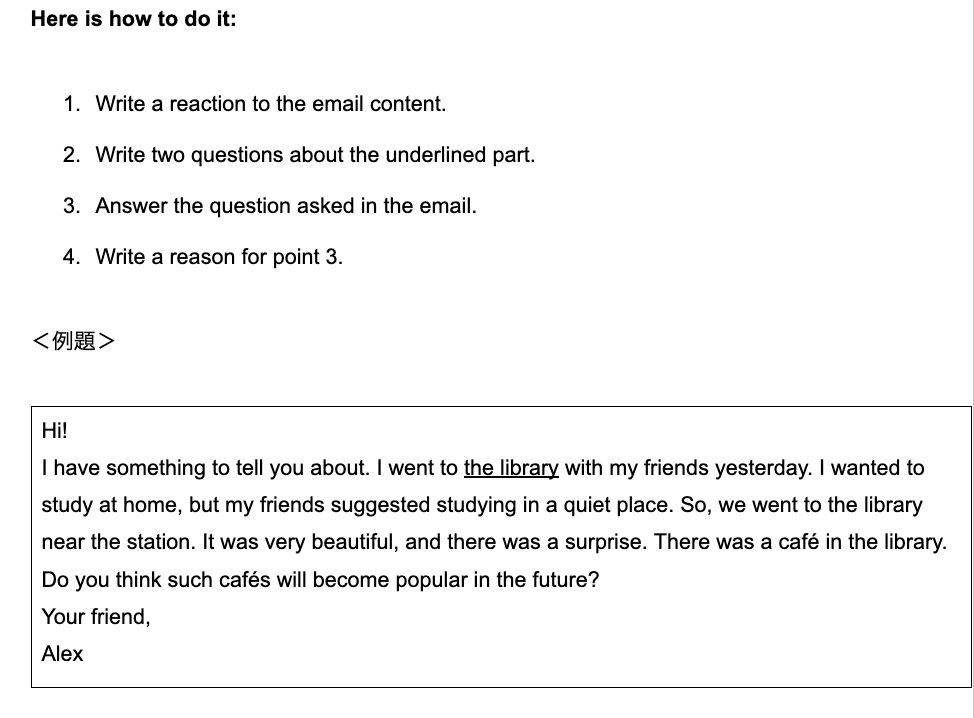こちら、みなさんご存知の準2級email問題(VE添削サービスより抜粋)です。〈例題〉の上部に次の記載があります。
