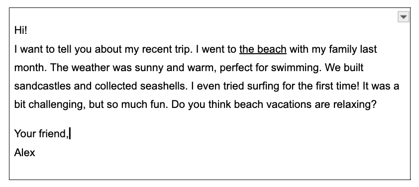 That sounds interesting. Do you liketo gogoing to the beach? Do you think the beach is good placesto relax? I think beach vacations are relaxing.I have two reasons.First of all, beach vacations are goodto relaxfor relaxing. Secondly, beach vacations are also funand enjoyable. (41 words/事務局加筆・修正後の受講生A様の解答)